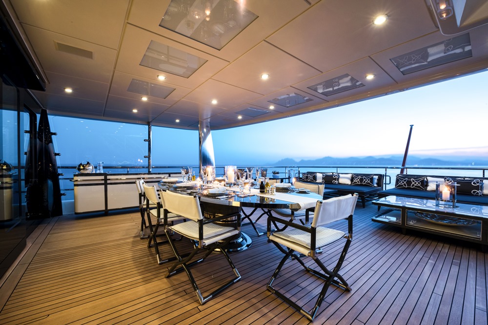 Speaking of front-row views, you can gather around a piano in the skylounge as well. Head back to the main deck to step out onto the balconies that fold out to each side of the saloon. The master suite has a fold-down balcony, too, naturally. Some of the best views come from the sundeck and upper deck of Elixir, though. Up on the sundeck, you can enjoy sunsets while the backlighting in the onyx bar becomes more prominent. All 12 of you will likely want to enjoy most meals alfresco aft on the upper deck. No matter if the weather turns a bit chilly: Overhead heaters keep it comfortable.