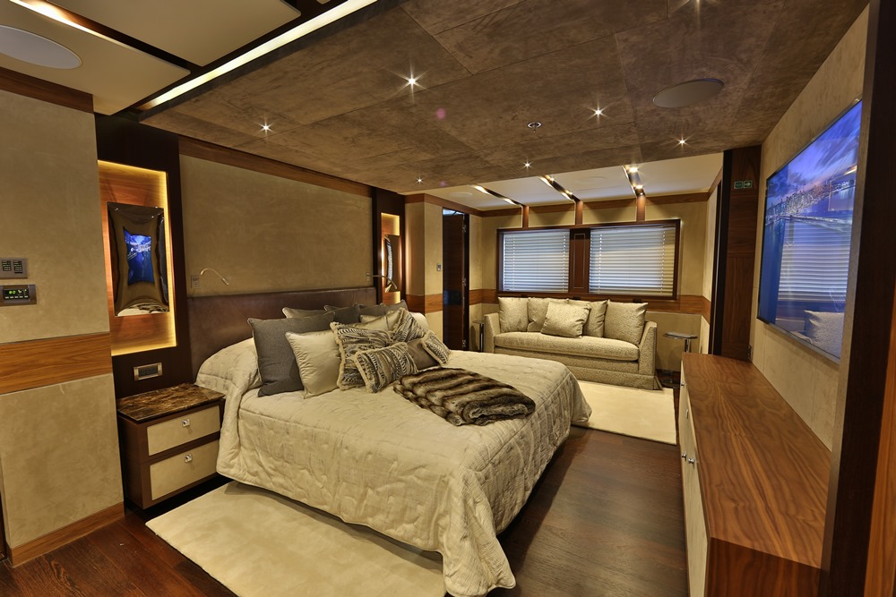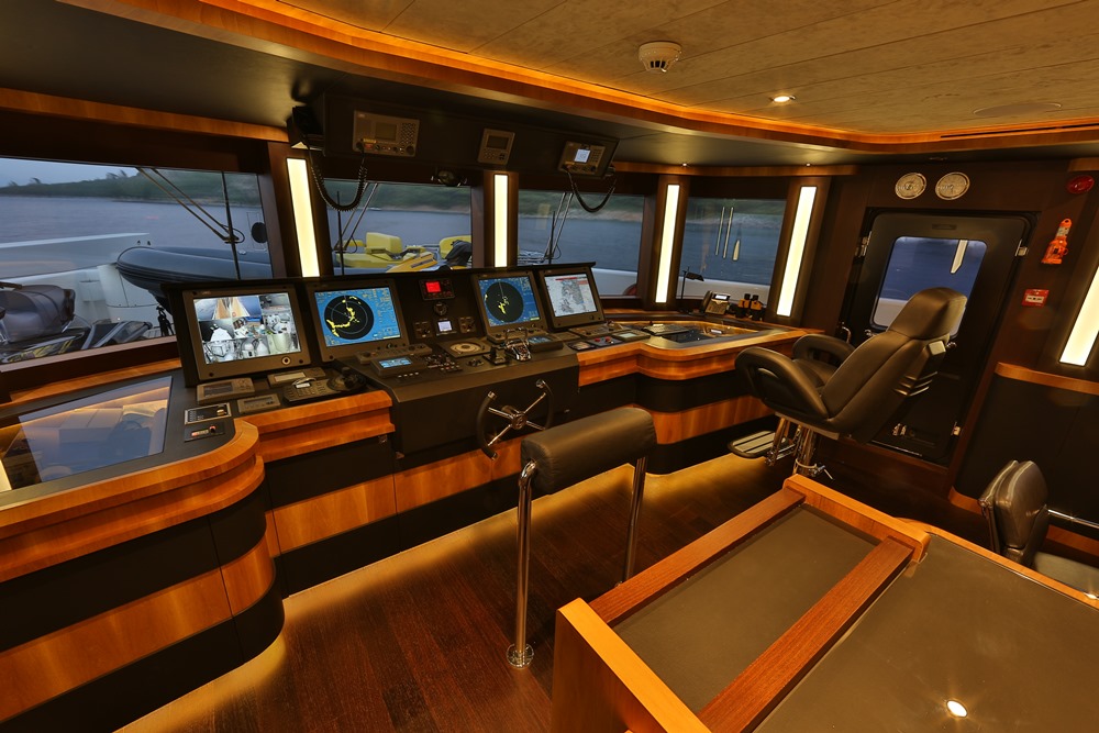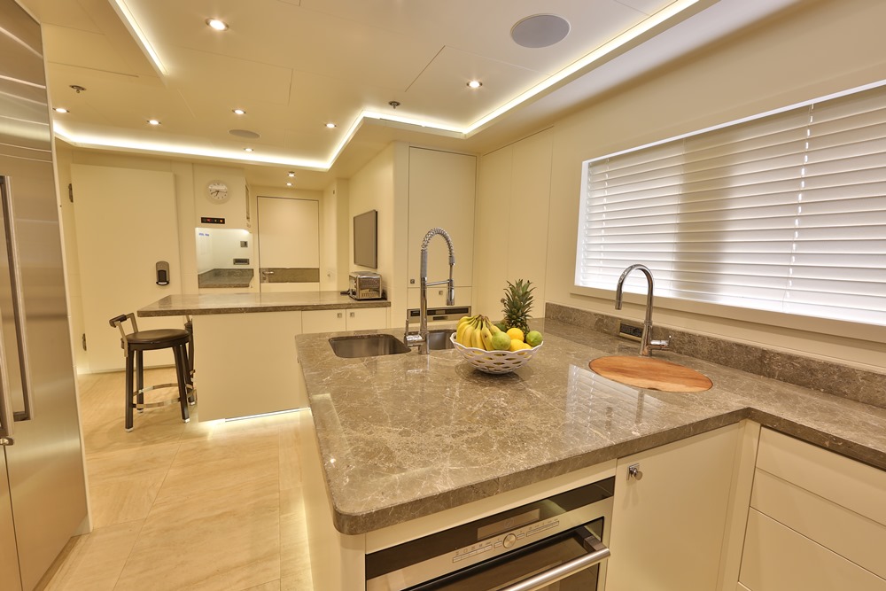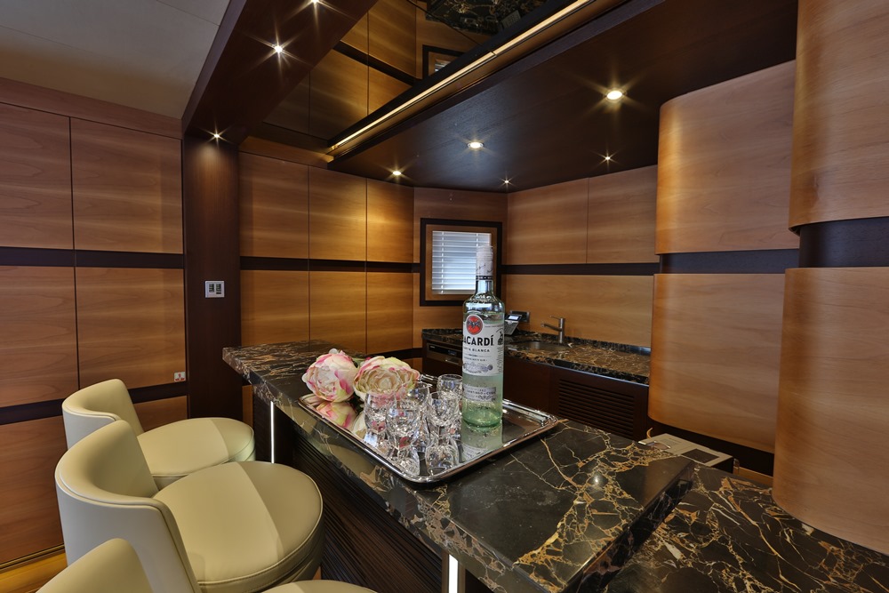 A key way that Giaola-Lu provides outside enjoyment: the indoor-outdoor skylounge (below). It’s an intimate space, ringed with sliding glass doors. A dining area here as well makes the room welcoming throughout the day and evening. Overall, the room follows the owner’s directive for a “contemporary, cozy, and natural” ambiance. Walnut and wenge with satin finishes mix with matte-finished olive wood throughout Giaola-Lu to set the mood. For luxe touches, stones—all sourced from Bilgin Yachts’ home of Turkey—range from white onyx to dark emperador marble.