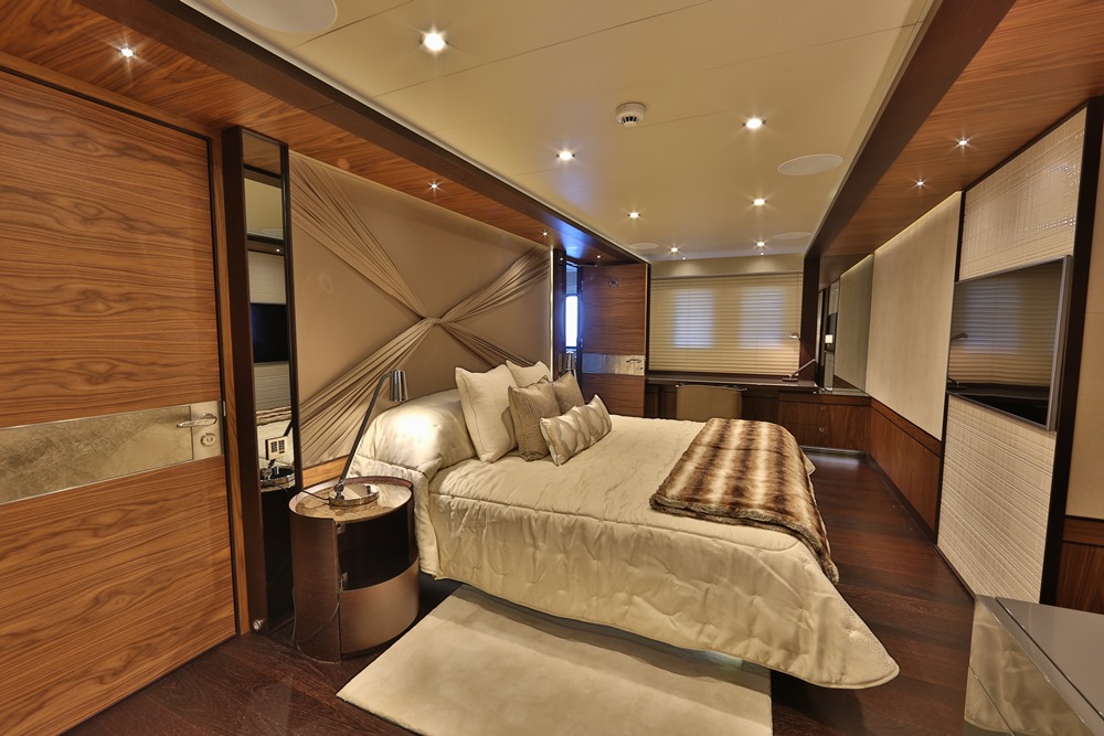To get the party started, Giaola-Lu has what Bilgin Yachts calls a “stadium quality” sound system on her sundeck. Rooms from the saloon to the skylounge have good-size TVs. Even the VIP, nearly equivalent to the main-deck master suite, has more than one television. Shuttling guests to and from shore comes courtesy of two Castoli tenders. One gets stowed just forward of the beach club, in a dedicated garage. The other joins two PWCs on deck, forward of the wheelhouse.