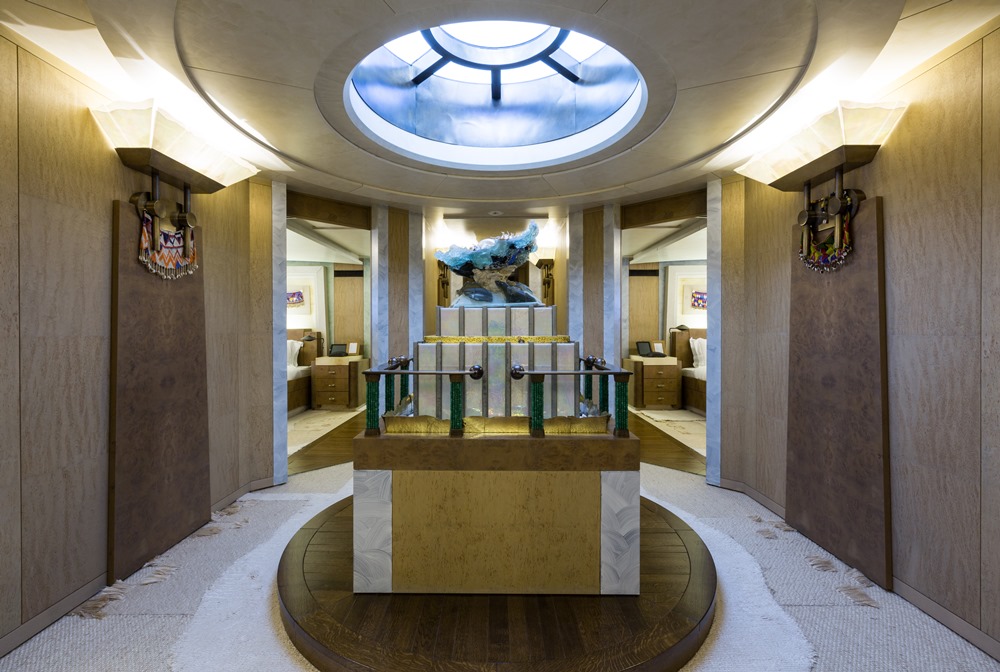 Tribal art, intricate wood chests with multi-colored pieces, a dramatic stairway sweeping up the center of her aft decks, and an unmistakable profile. They are all due to the creative genius of the late Jon Bannenberg, who worked with her original owner on styling and interior design. They are also due to the original owner himself, who kept her in pristine condition all these years, only selling her recently. A group of owners, which include Lürssen, decided to buy her and offer her for charter, while preserving Bannenberg’s creations. Come take a tour.