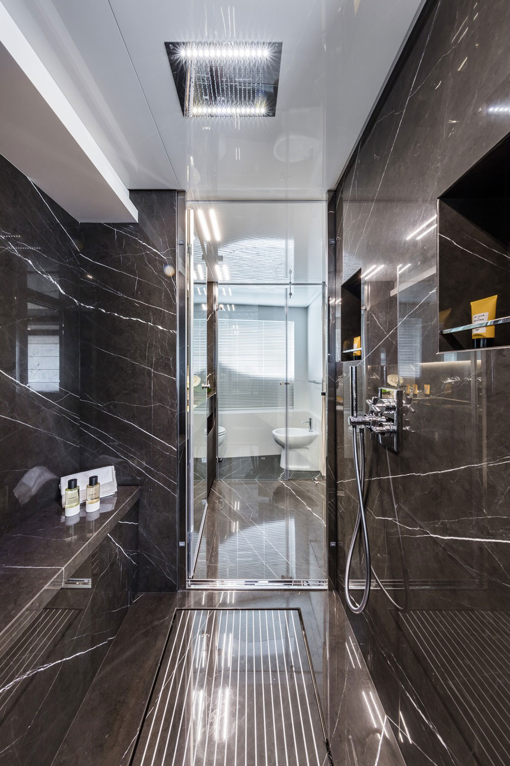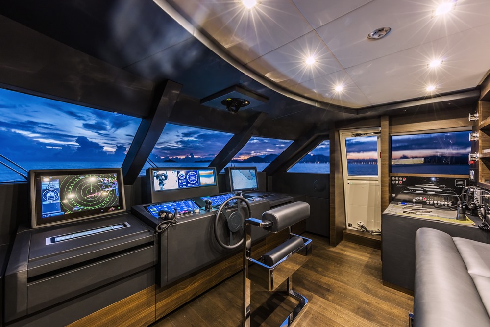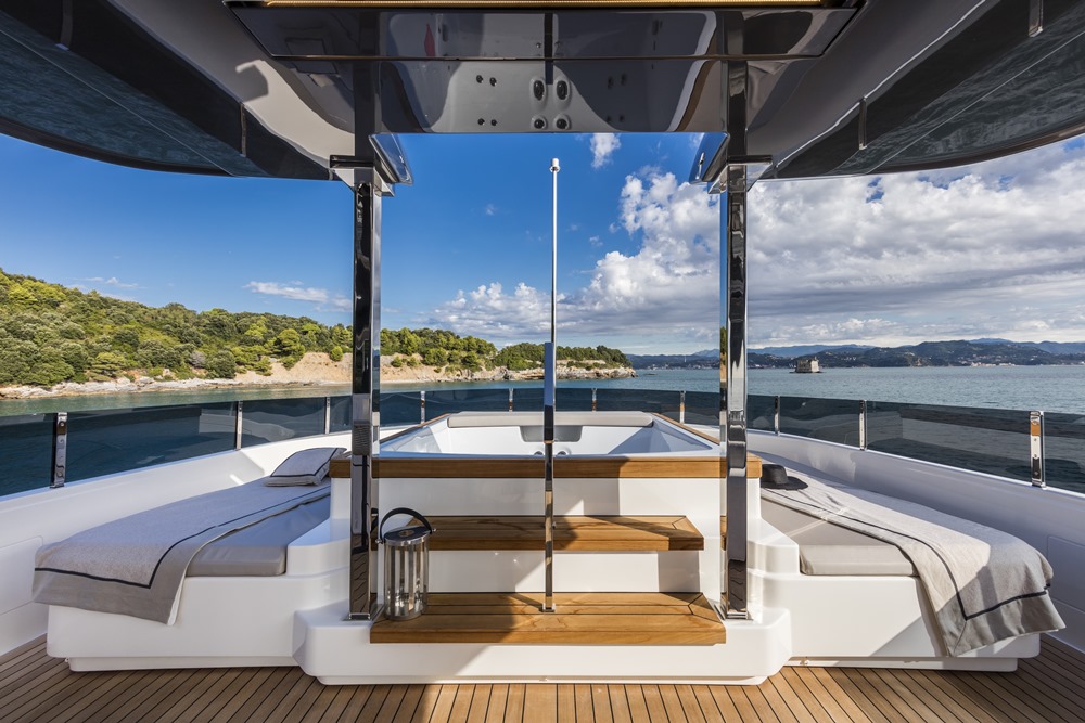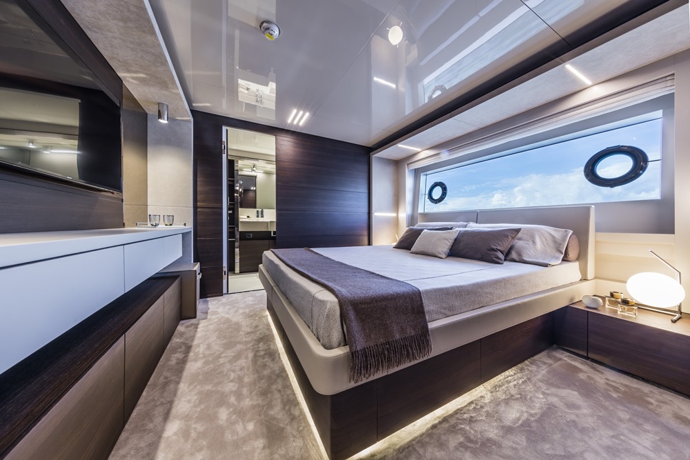 Clients will appreciate seeing things they’d expect to find. This includes a master suite on the main deck, spanning the full 26-foot (8-meter) beam. Owners of the Navetta 37 get a nicely outfitted office/reading nook as part of the suite, too. We say “reading nook” due to the way hull number one appears. She features a big walnut-wood bookcase in the office, along with additional shelves, all further outfitted in leather. The megayacht also includes four guest staterooms below decks, made inviting especially due to large ports. Custom Line claims these are among the largest windows you’ll see for similar cabins aboard other yachts. All spaces below and above deck on hull number one show off dark-walnut furnishings, leather, and lacquered surfaces. The main deck (below) also has oak soles. Custom Line’s in-house design team selected numerous accessories, chairs, and more from fellow Italian brands, like Paola Lenti.