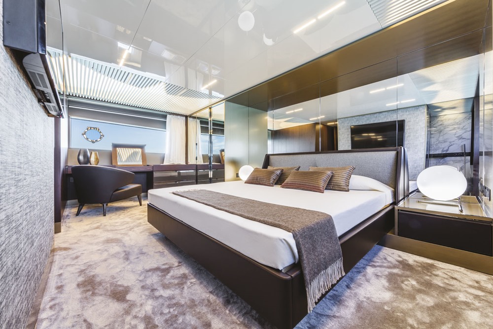 Speaking of being both decorative and functional, take a good look at the galley (above). It’s situated fully forward on the main deck. (The master suite joins three guest staterooms below decks.) Aboard some Italian-built yachts, the galley is relegated to tiny quarters, sometimes below decks, too. The light, bright treatment aboard the Ferretti 850 should inspire you or your chef to whip up many a culinary creation. Because Ferretti Yachts knows its customers are accustomed to options, there’s yet another welcoming configuration. It sits to port with a cocktail bar open to the saloon. This in turn sees the wheelhouse gain a small lounge.