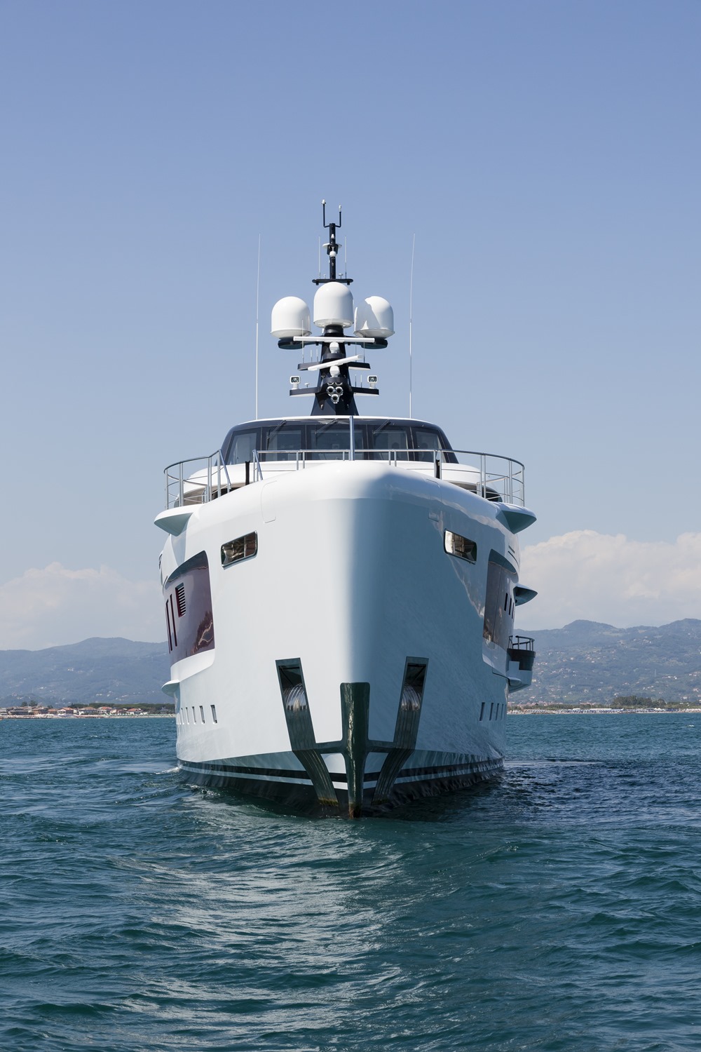 The owner may also wish his guests to heed the environment. He commissioned Quinta Essentia with a hybrid propulsion system. Two 1,400-hp MAN diesels connect to electric motors and, in turn, variable-speed gensets. Electric-only power, of course, means no emissions. The hybrid arrangement allows for better fuel burn and range, too. For example, at 9½ knots, she should burn just 23 gph (88 lph). She should also see a range exceeding 6,500 nautical miles. With her diesels engaged, Quinta Essentia should see a cruising speed around 12 knots and a 3,500-nautical-mile range.