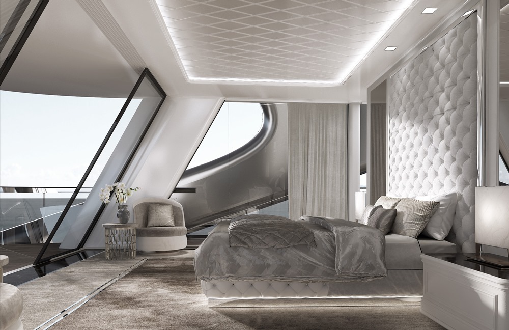 In seeing Attitude from the side (above), you better appreciate the different approach to styling and spatial relations. Carlo Colombo prides A++ on addressing projects from both the interior and outside. He points out, rightfully so, that most yachts have separate interior designers and stylists. This can sometimes lead to out-of-sync spaces. Ultimately, of course, Attitude’s buyer can tailor the layout and decor, for 10 guests and nine crew. But, Rossinavi and A++ have a few proposals to make the most of the 30-foot (9-meter) beam. As seen below, they elicit the sensation of being in “a luxury villa in a true transportation from land to see,” Carlo Colombo explains.