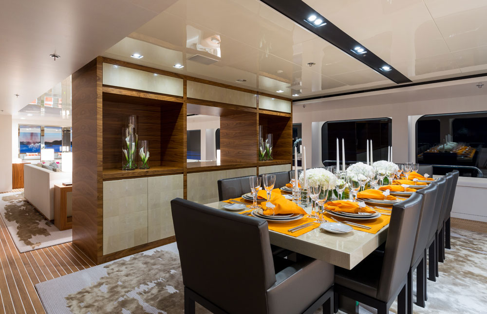 If the silver hull doesn’t clue you in, the minute you step inside, you’ll see how the owner, a repeat Christensen client, created his own atmosphere. With VARO Interior Design, he selected milk-glazed sycamore paneling. Set amid this pale backdrop are custom rosewood furnishings and a teak and holly sole (whose planks seamlessly stretch the length of the 160-footer). Add in attention-grabbing accents like a mother of pearl wall in the dining area and stingray skin on the divider between the saloon and dining area, and Chasseur is about as contemporary, and as custom, as you can get.
