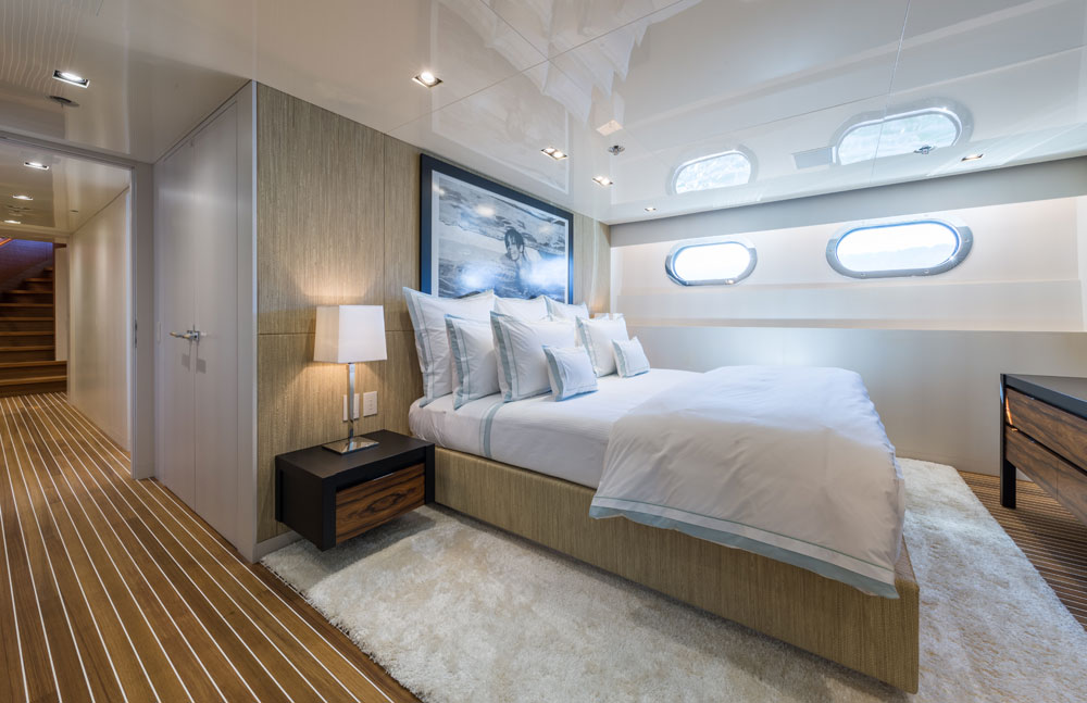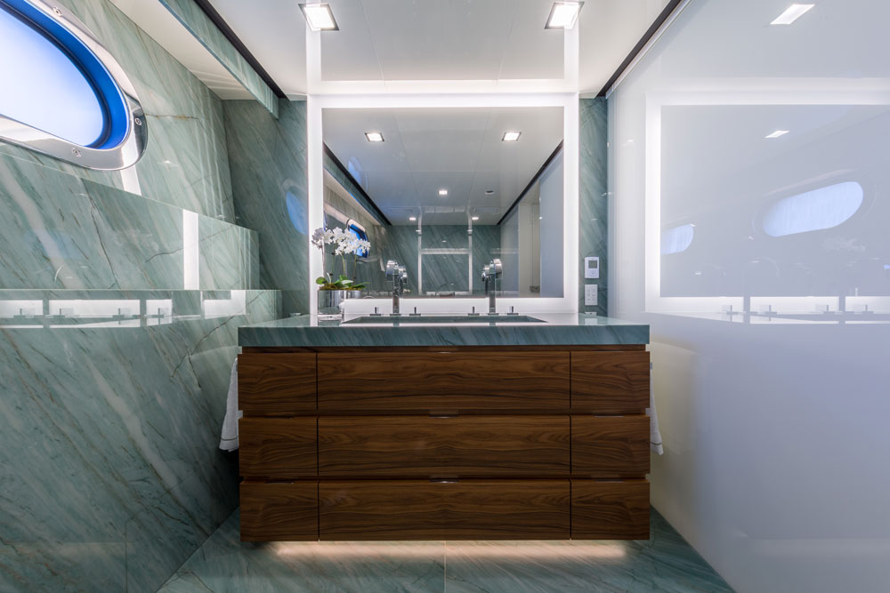 With a 29’6” beam, Chasseur is plenty comfortable for her owner’s party of 10. But her owner hasn’t overlooked his captain or crew. If you didn’t realize you were standing in the captain’s cabin, you’d easily mistake it for a guest room. The black and white onyx in the en suite bath and color-coordinated linens are on par with the workmanship and decor of the four guest staterooms below. The skills of Christensen’s in-house cabinetry and stone shops are on display here, and indeed throughout the megayacht.