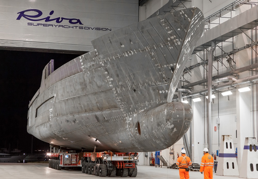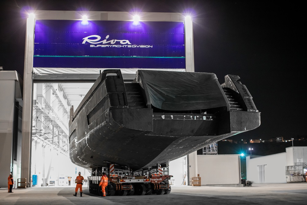 Sometimes, seeing just part of a megayacht, and it out of the water, puts the size into perspective. Having it occur under the dark of night gives it a different dimension, too. At the end of February, Riva transferred the hull of the very first Riva 50M into her purpose-made completion shed. As you would expect, the builder documented the whole historic process.