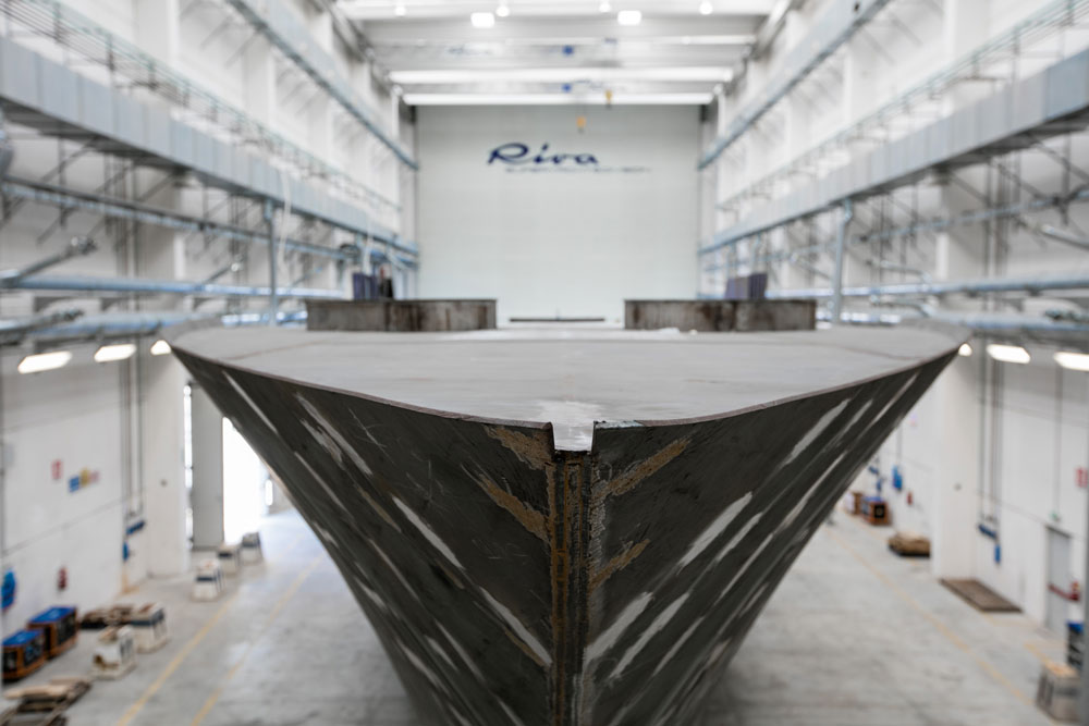 Being the first project in the Riva Superyachts Division is significant. Also notable, the Riva 50M is the first steel yacht for the brand. The hull further has a beam of 29’5” (9 meters). The superstructure, still in development, is naturally made of aluminum. They’ll come together later this year in the completion shed in Ancona, Italy. In fact, the shed is on the same premises as Riva’s sister brand, CRN. A section of CRN’s property is now devoted to megayachts for fellow sister brands Custom Line and Pershing, too.