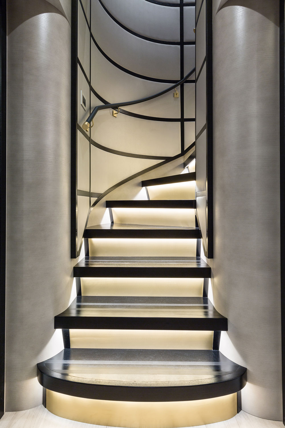 There’s a lot of interplay among tones of grey, black, and white aboard Da Vinci. The owner collaborated with Maxine Tissenbaum, a Canada-based designer, to create complexity. Ash is the predominant wood, stained each of the just-mentioned tones. Though, stepping through the main-deck entry (above), you’d be forgiven for not paying attention to wood being aboard. Three types of marble underfoot—black Zebrino, black and white veined Marquina, and blue Palissandro—command attention. Furthermore, they’re each different sizes and shapes. Together with the mirror-like, painted black glass cabinets running floor to ceiling, it’s a dramatic setting.