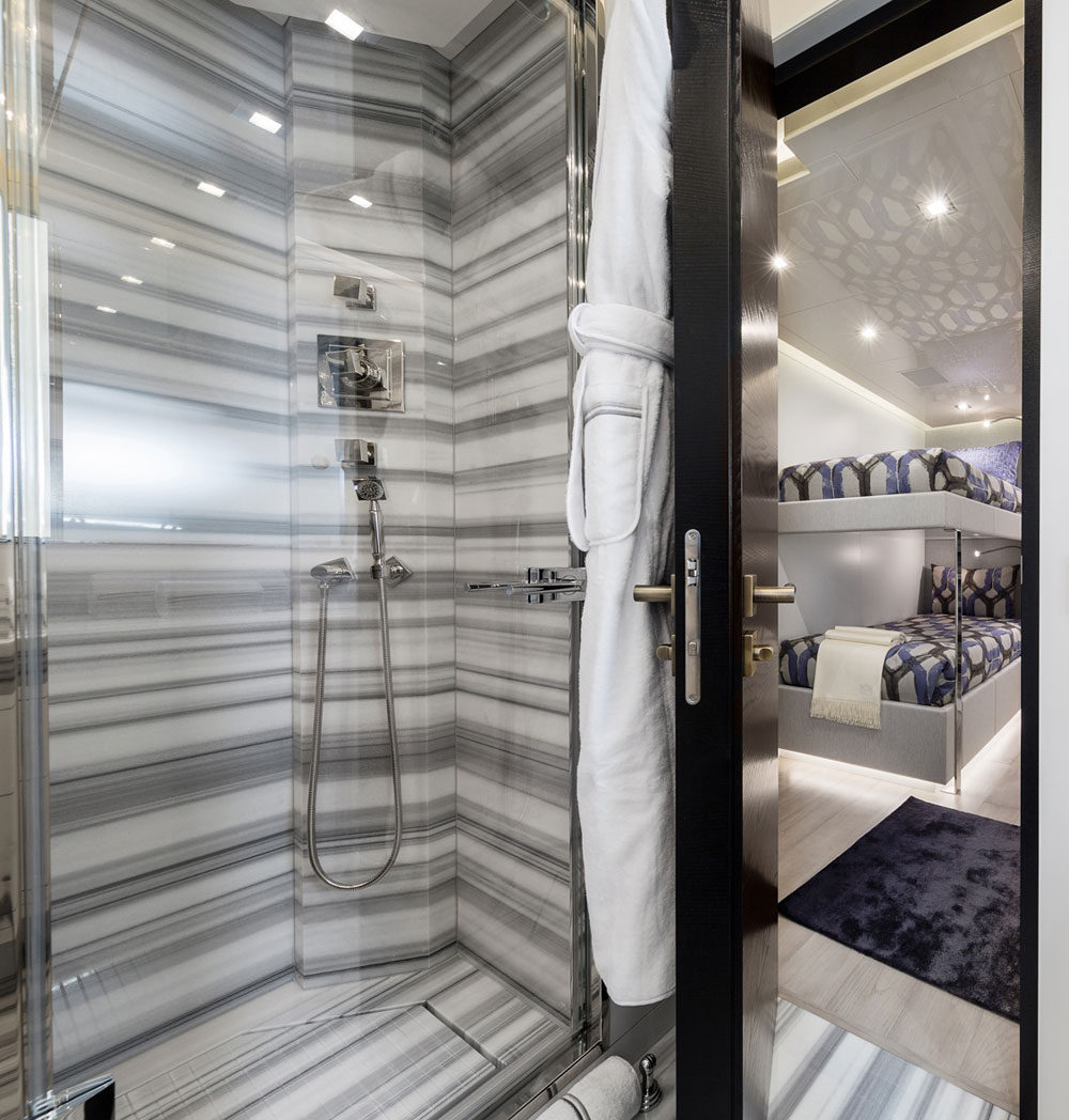Due to the main-deck devotion to entertainment, all sleeping spaces lie below decks. Da Vinci reserves full-beam accommodations for the owner, of course (above right). Plenty of pearly whites, polished brass, and black contrast and complement each other here. Grey and white adorn the VIP, while black and white characterize one of the other guest staterooms. The remaining guest stateroom (above left), though, is decidedly different. Da Vinci’s owner wanted two sets of bunk berths. In yet another artistic twist, slanted steps set into in the wall lead to the top bunks. Additionally artistic, the steps are black wood, flanked by grey marble.