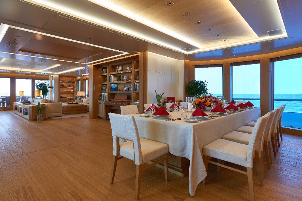 Even with her size, Project 783 has several cozy arrangements inside. The saloon features intimate seating arrangements, for example. They’re strategically alongside the floor-to-ceiling windows, inviting guests to take in the passing scenery while cruising. So, too, is the formal dining area flanked by floor-to-ceiling windows, perfect for enjoying the sights of each anchorage.