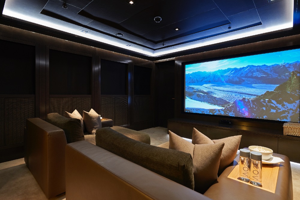 Scenery of a different type appears in the two onboard cinemas. One is an indoor theater with plush seating, while the other is up on the sundeck. Come nightfall, a projector in the seating area facing the mast plays guests’ favorite flicks on the screen just opposite.