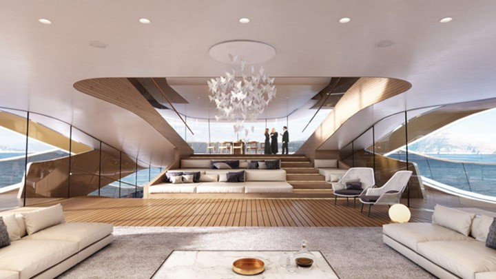 Of course, you’ll find an owner’s apartment with private alfresco space, plus other must-haves, aboard Se77antasette. But, you’ll also find an unusual observatory-like space on the uppermost deck. Meant for everyone to enjoy, it has a glass overhead, which Benetti says meets practical stress testing. Romero envisions it as a stronger way to enjoy the surroundings. Being a fan of transformational spaces, he also suggests using it as an augmented-reality display. Interestingly, no navigation mast interferes with the views, because it’s retractable. Romero collaborated with Benetti’s engineers to make it possible.