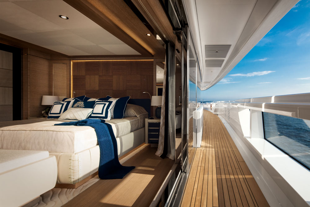 As you would expect, the owner’s suite enjoys the lion’s share of space aboard Cloud 9. Spanning the 44-foot (13.5-meter) beam, it’s an aerie well above the waterline. In fact, the suite is part of a full owner’s deck, with private access. Since family is important to the owner, the suite includes a family saloon. It’s ideal for movie nights, since it includes a large TV and settee arrangement. Better yet, it’s ideal for alfresco movie nights, since sliding glass doors open it up to the aft deck.