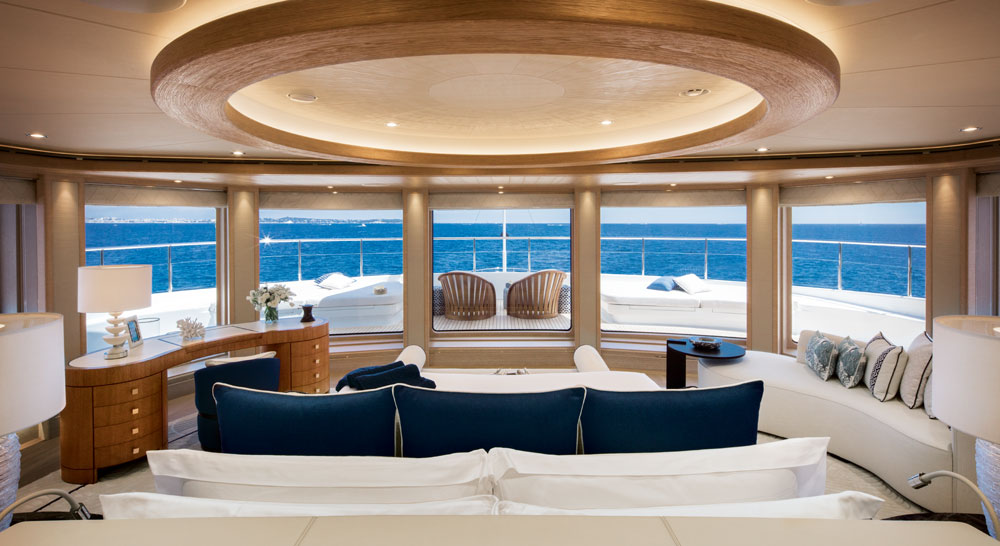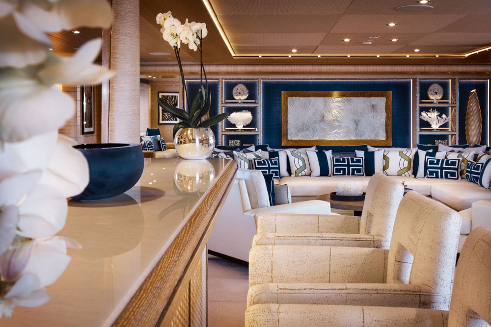 In fact, oak paneling sets the relaxed scene throughout Cloud 9. So, too, do marine-oriented art pieces, varying hues of blue and white, and bas-relief art (above). Winch Design executed the owner’s wishes in these regards, further using mother of pearl in varying spaces. Interestingly, the decor is deceivingly low-key. If laid end to end, the design details aboard Cloud 9 would stretch well more than 3,281 feet (1,000 meters).