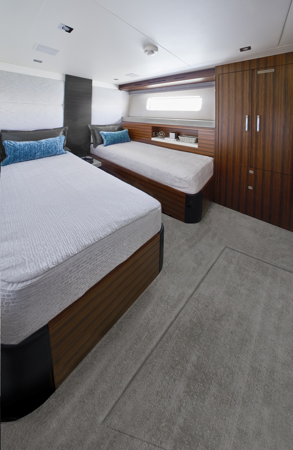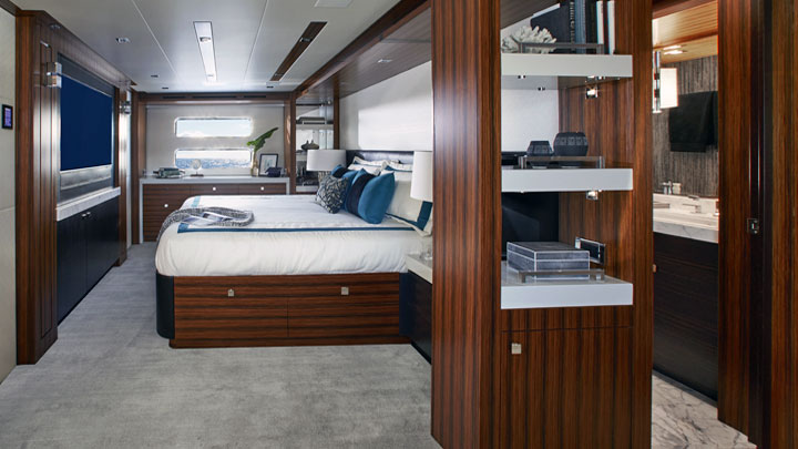 As much as megayachts are made for owner and guest comfort, crew need to be happy, too. Hatteras was more than mindful of this in creating the proprietary HattCON. In brief, it integrates navigation control, systems monitoring, all onboard lighting, climate control, and a host of other functions into four dash displays. Three are upright touchscreens, while an in-dash monitor with traditional controls comes in handy in sloppy seas. It’s the type of seamless integration expected of far larger megayachts. It also has a safety lock, a fingerprint reader with a backup digital passcode, to prevent yacht theft. In addition, HattCON puts a 10-inch display in the crew’s quarters and one in the galley. Furthermore, auto-dimming touchscreens for lighting and climate control mount in each stateroom. So, too, do iPads offer fingertip control over music and movies.
