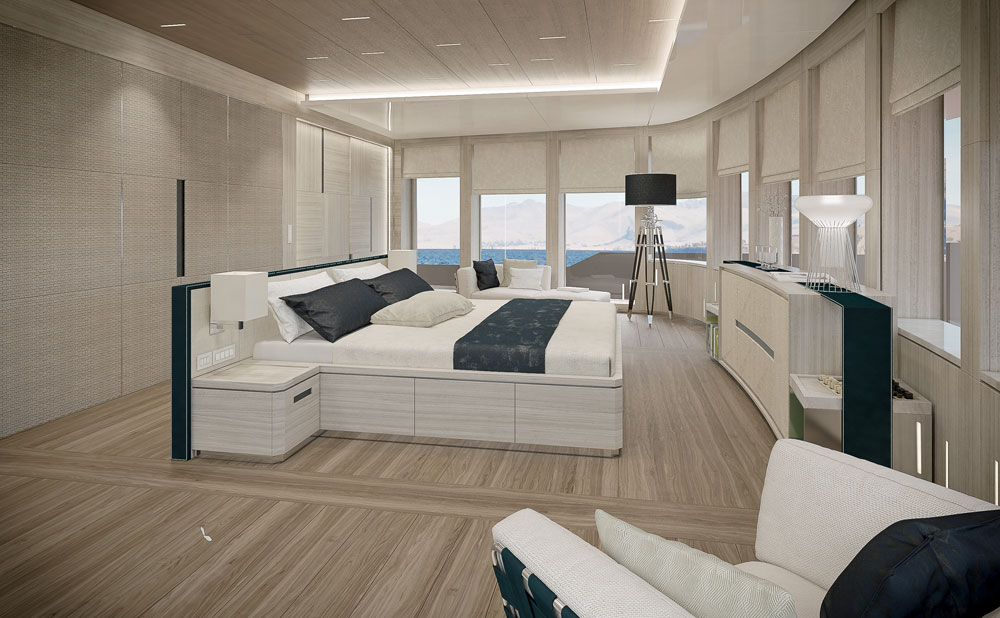 Hot Lab has been working with the owner to execute a subdued, and certainly minimalistic, decor. The look extends from the saloon to the sky lounge, the latter doubling as a movie room or business boardroom when needed. Interestingly, AES Yacht built a full-scale mockup of one of the three VIP suites, outfitted with all of the hardwoods and other solid materials, for the owner’s benefit.
