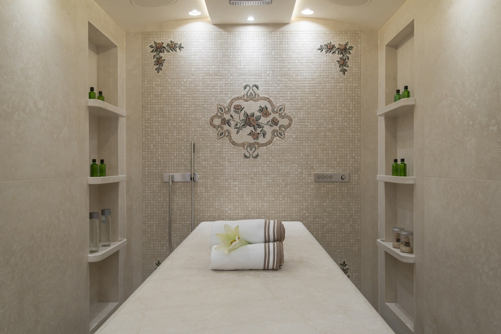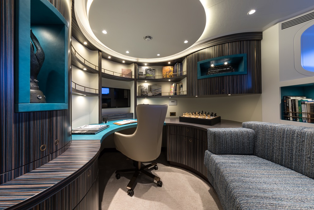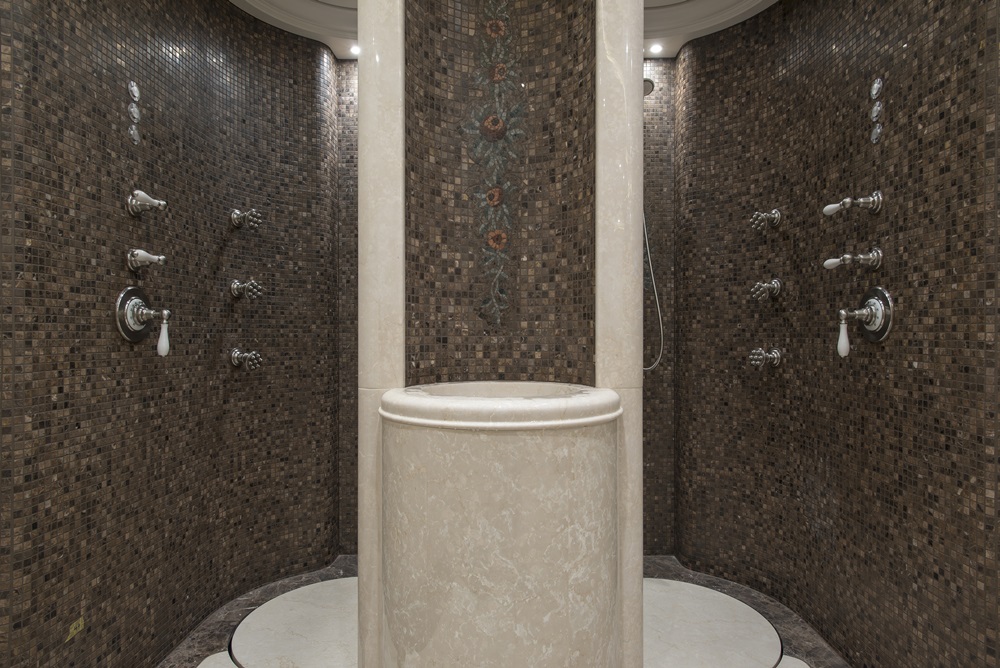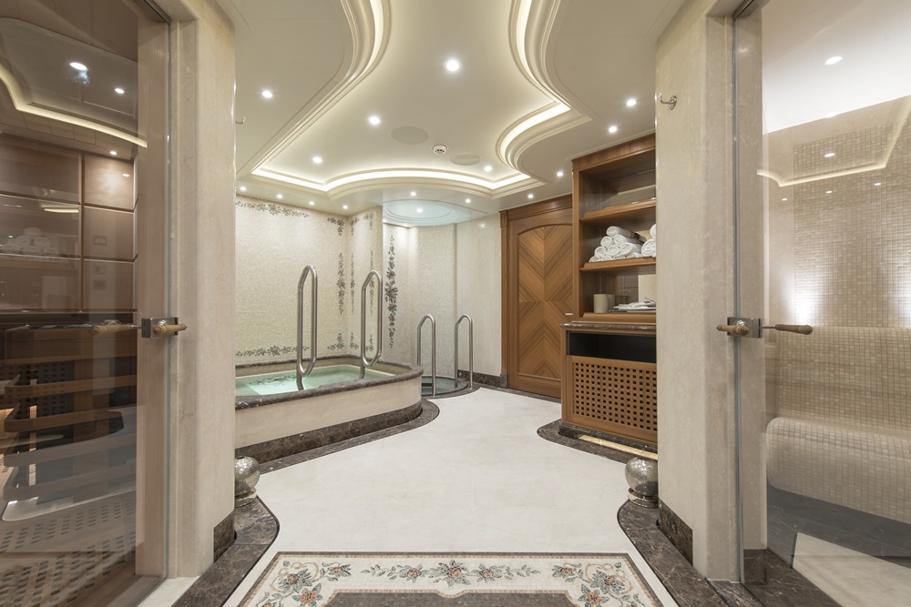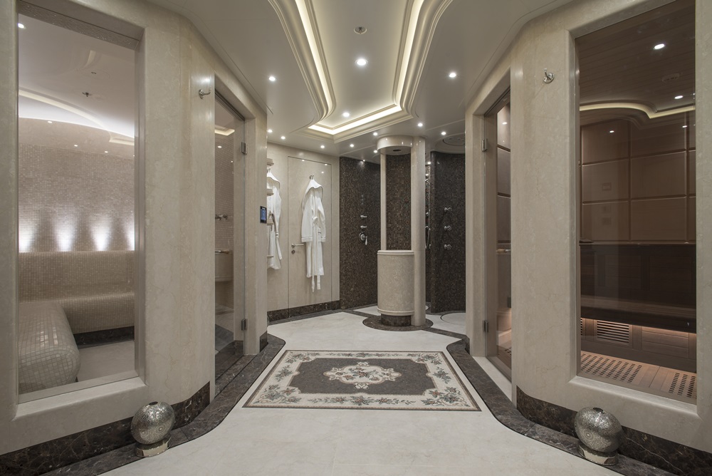 - Areti, by Winch Design. The owner tasked Winch Design with creating warm, home-like areas for a party of 18. The owner’s beloved cycling team is included in that party, and therefore a big inspiration for art, special storage, and the spa. Indeed, the spa had to cater to them post-rides, for them to soothe sore muscles. Therefore, the expansive spa features a private massage room with a heated marble table and a Vichy shower. It also has a steam room, a sauna, a plunge pool, a shaved ice maker, a hot tub, and a banya (Russian bath). Of course, the spa couldn’t just be utilitarian. In keeping with customary superyacht interior designs, Areti’s spa showcases roses made of hand-laid mosaic tiles. It’s the work of Andjelka Radojevic, a renowned Serbian mosaic artist. In the banya, Winch Design and the owner chose traditional accessories like birch and eucalyptus branches, timber knives, and felt hats. In addition, “experience” showers feature multiple aroma, light, and sound settings. Topping it all off, the spa entry lobby contains a display case for several bicycles.