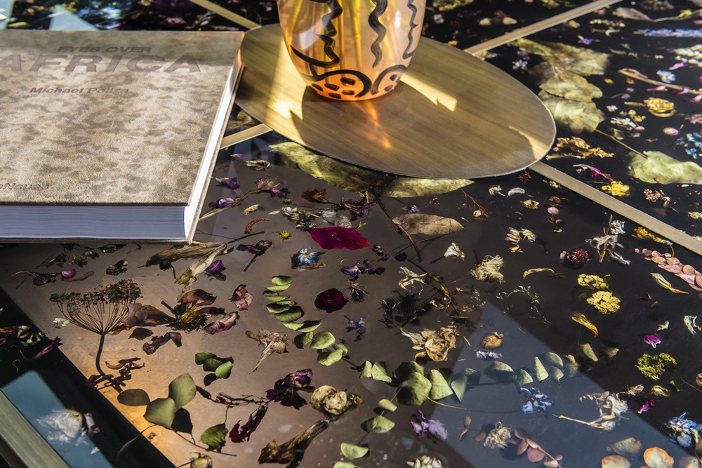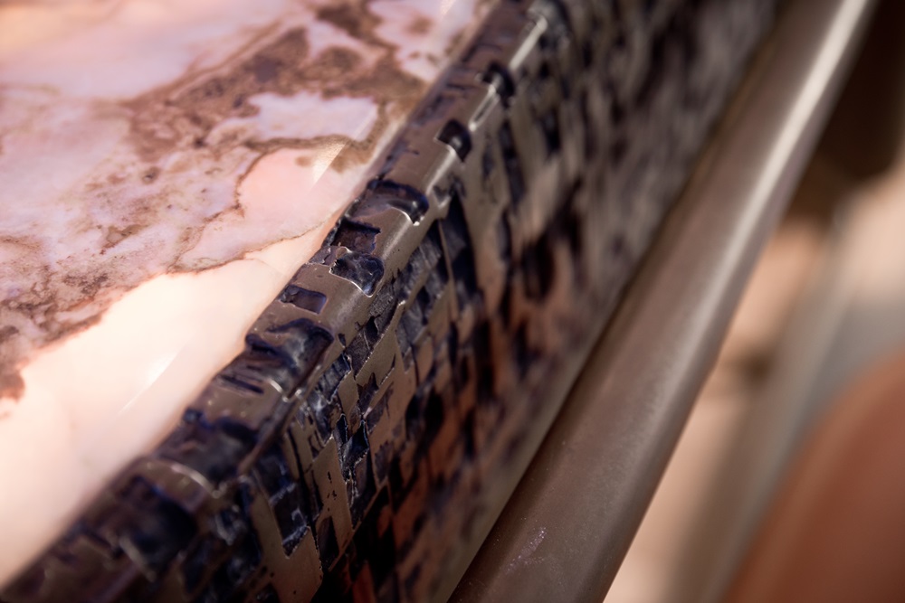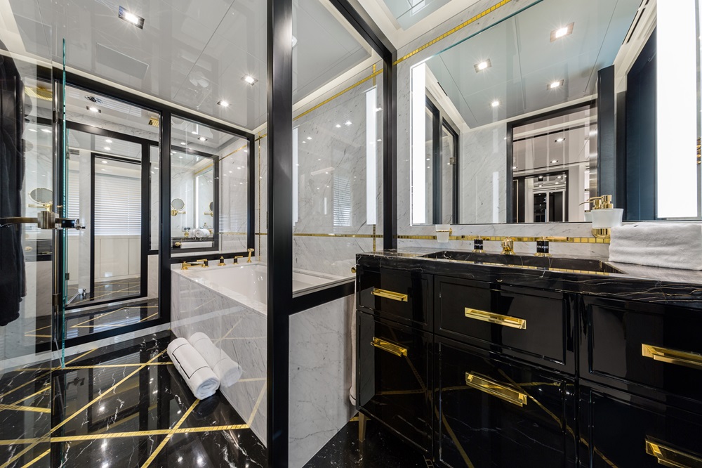 - Da Vinci, by Maxine Tissenbaum and Overmarine Group design department. The owner of Da Vinci wanted multiple marbles to make maximum impact upon entering the saloon. He succeeded in working with Canada-based Maxine Tissenbaum and Mangusta’s in-house team. Black Zebrino, black and white veined Marquina, and blue Palissandro marble comprise different dimensions. Black Zebrino marble covers the long bar to port in the saloon, too, complemented with brass accents. And who could miss the dozens, if not hundreds, of small mirrored segments making up the art center stage in the dining area? There are so many, in so many different shapes and sizes, that you need to step up close to appreciate the complexity. They catch the light, making the already-light ambiance even brighter.