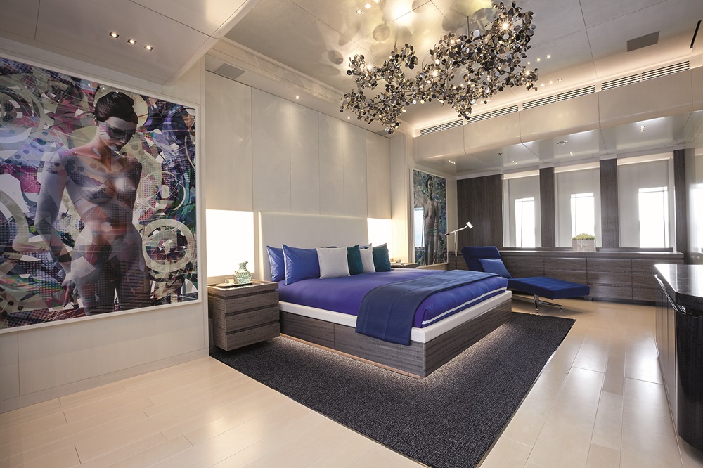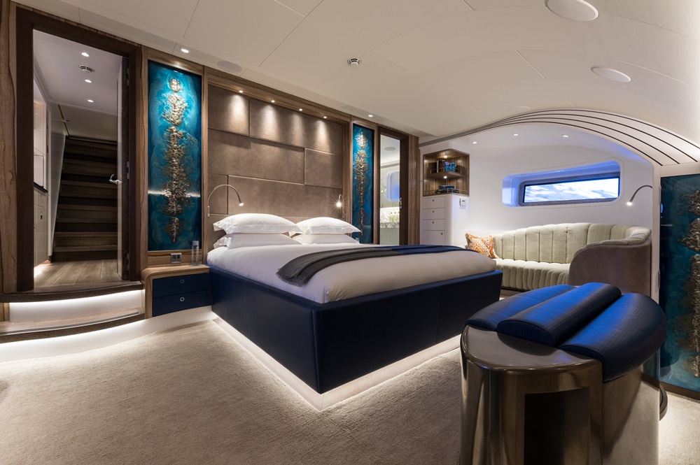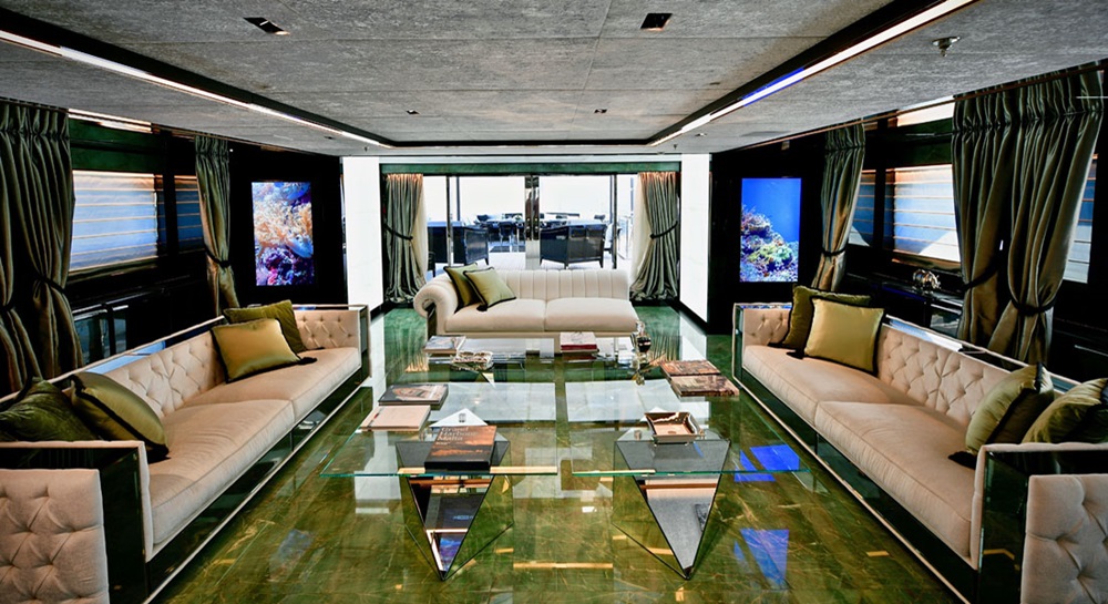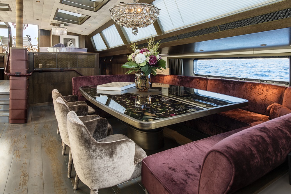 - Sarastar, by Luca Dini Design. To say that color explodes aboard Sarastar is an understatement. Much comes from nearly a dozen different stones, including white onyx, varying marbles, and semi-precious stones. Green onyx, for example, flows from the saloon entrance through to the dining area. Backlit onyx encases two pop-up bars separating these seating and dining areas as well. Color further comes from custom, silver-toned, silk wall coverings, additionally painted and/or embroidered (by hand, naturally). It’s particularly noteworthy in the master suite, as you’ll see. Sarastar’s owner challenged Luca Dini, along with Silvia Margutti and Gabriele Tartarelli, to create an unconventional, inventive, and inimitable decor. Lighting needed to play a role in all of this as well. Don’t miss the amber-tone, crown-like light above the dining table, custom made for Sarastar by Baldi. (Interestingly, that same crown effect serves as the base for the onyx-slabbed dining table.) Then there’s a glass sculpture, again commissioned for the yacht, rising through the spiral staircase.