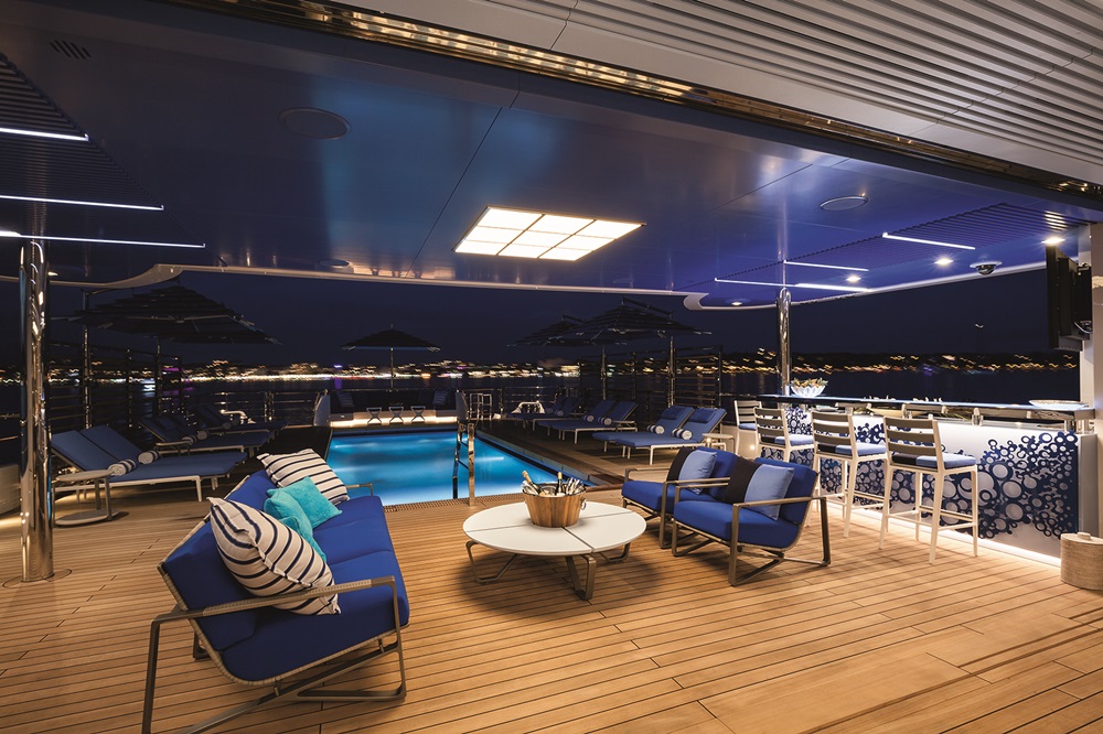 - Pink Gin VI, by Design Unlimited. Bold, daring, decisively different. Each of these adjectives applies to the look aboard Pink Gin VI. Befitting a yacht named for a special drink, she has a singular, and certainly surprising, blend of textures and tones. Pink appears, of course, in leather. But so do varying other tones in leather, along with velvet. You’ll also find bronze, copper, pewter, petrified wood, resin-encased flower petals, and salmon skin. We’d be remiss in not mentioning the lilac custom piano in the saloon. The most eye-catching of all of her design elements, though, are chandeliers. They’re not only in the dining areas, they hang outside. In fact, two 3-foot-high (1-meter-high) Murano glass chandeliers hang from the boom during some get-togethers.They’re bound to surprise guests as well as anyone who sees Pink Gin VI on the water. And that’s part of the reason they’re there. In fact, neither Design Unlimited nor Baltic Yachts, the builder, disclosed details about them until the yacht’s official reveal at the Monaco Yacht Show.