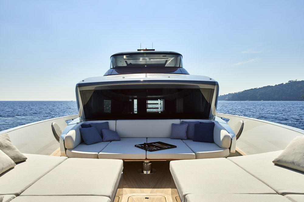 “It’s a little revolution,” declares Massimo Perotti, Sanlorenzo’s CEO, regarding the SX88. In fact, the SX88 is an open space in the shape of a boat, where inside and outside are always in contact. Stepping onboard is truly a new experience. Enter from the astonishing stern, five steps below the main deck. When free from tenders and toys, it’s a beach area, 323 square feet (30 square meters) shaded by umbrellas. It’s perfect for dipping your feet in the water, since the platform extends two feet (0.6 meter). The aft main deck has settees to extend the interior living space. Yet another cozy, private seating and sunbathing area comprises the foredeck. It, too, can directly connect with the interior.