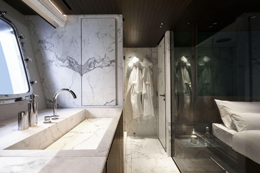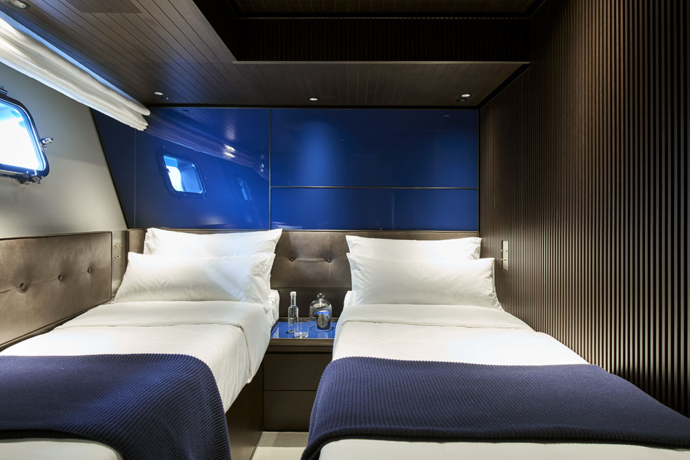 Interestingly, below deck, the Sanlorenzo SX88 has the classic nautical division of service corridors and sleeping zone. Four staterooms total, including the owner’s cabin, are down here. The owner’s cabin reflects originality in design, with a glass wall dividing the bedroom from the bath. This allows sunbeams to flood in from the bath, outfitted with Calacatta marble. As for the rest of the staterooms, the décor is defined by the same stylistic code. Only the color of the painted-glass headboards differs, with a palette of green and blue. Lissoni chose these to recall the SX88’s natural surroundings.