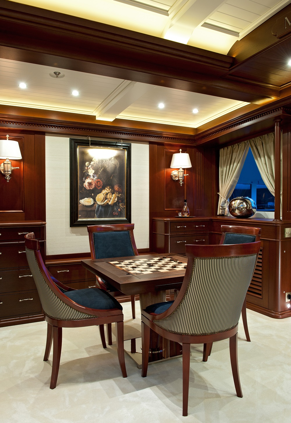 The original owner tasked Ken Freivokh Design with giving her graceful styling and equally graceful interior spaces. As you’ll see in our slideshow, the onboard ambiance is classic. Dark woods like mahogany dominate in dining areas, saloons, and staterooms. Though, don’t interpret “dark woods” to mean the interior is dark, or even dim. Freivokh incorporated clever skylights, grouped around the central mast, to ensure plenty of daylight would come inside. In addition, timeless white overheads with dark crossbeams keep things light.
