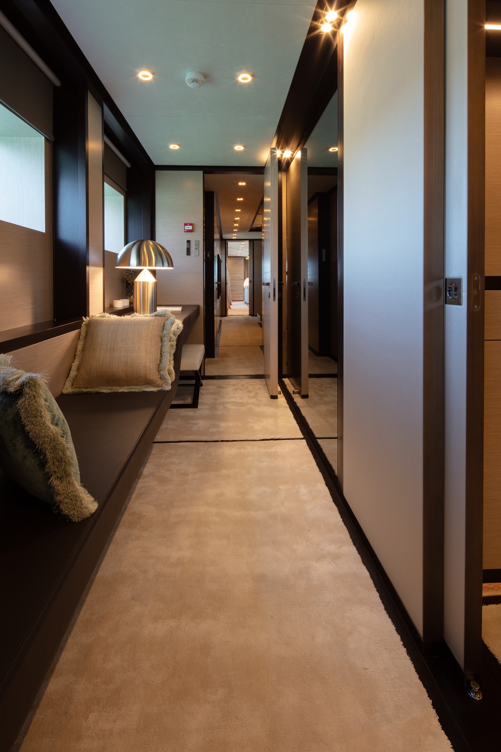 Another special design request: Agora III has both a desk and a daybed in entry to the owner’s suite. Even with the work desk, however, the owner seems to prioritize relaxation. This is because Agora III further has an inviting settee as well as a reading lounge in proximity to the bed (above).