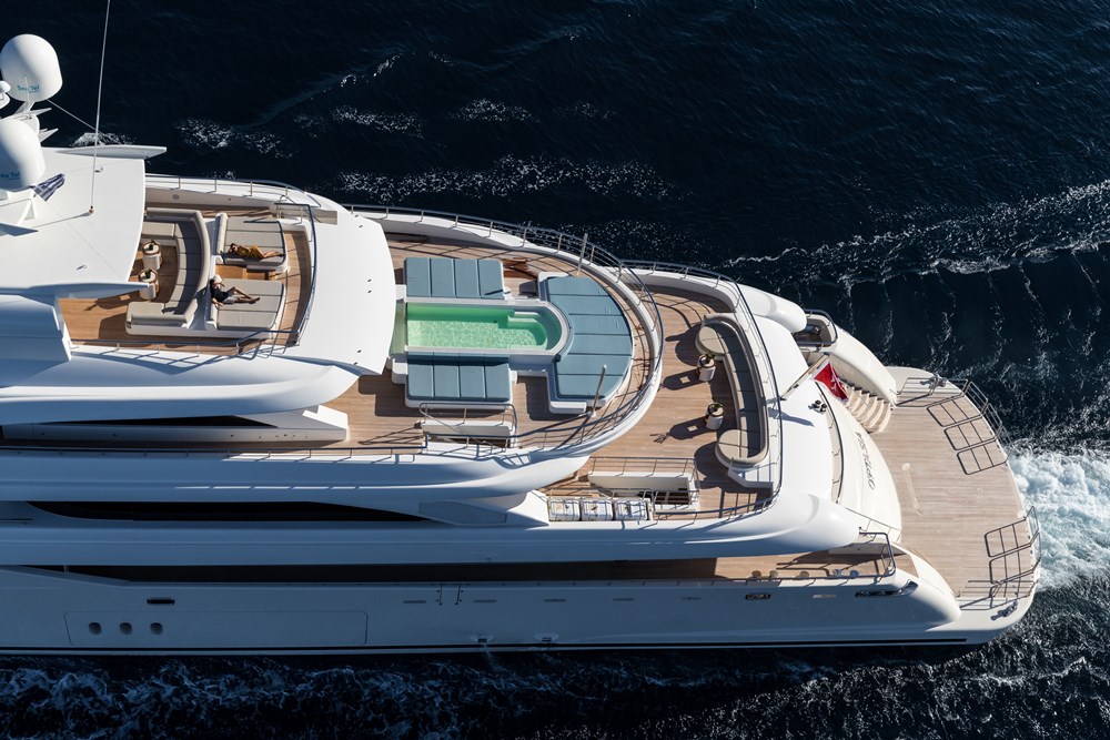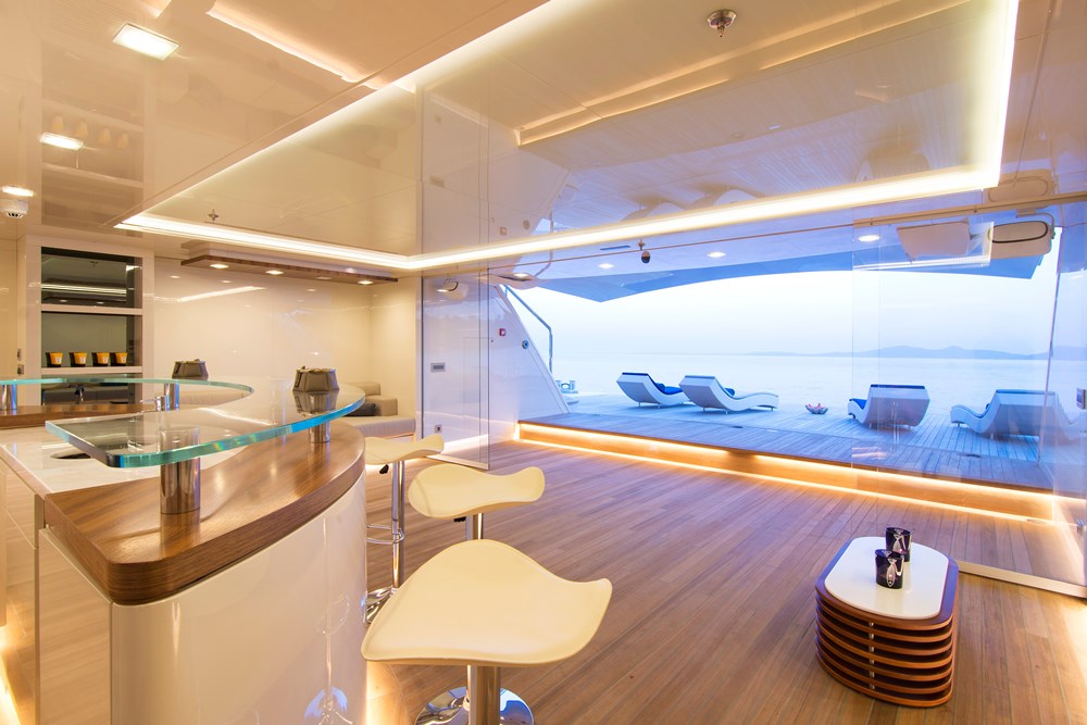 At 2,350 gross tons, O’Ptasia looks and feels voluminous. Thankfully, her generous 45’3” (13.8-meter) beam does not overwhelm. Dragnis credits Studio Vafiadis with properly balancing large, open alfresco areas with equally large but welcoming interior areas. “I adore her great lightness and brightness,” Dragnis says.