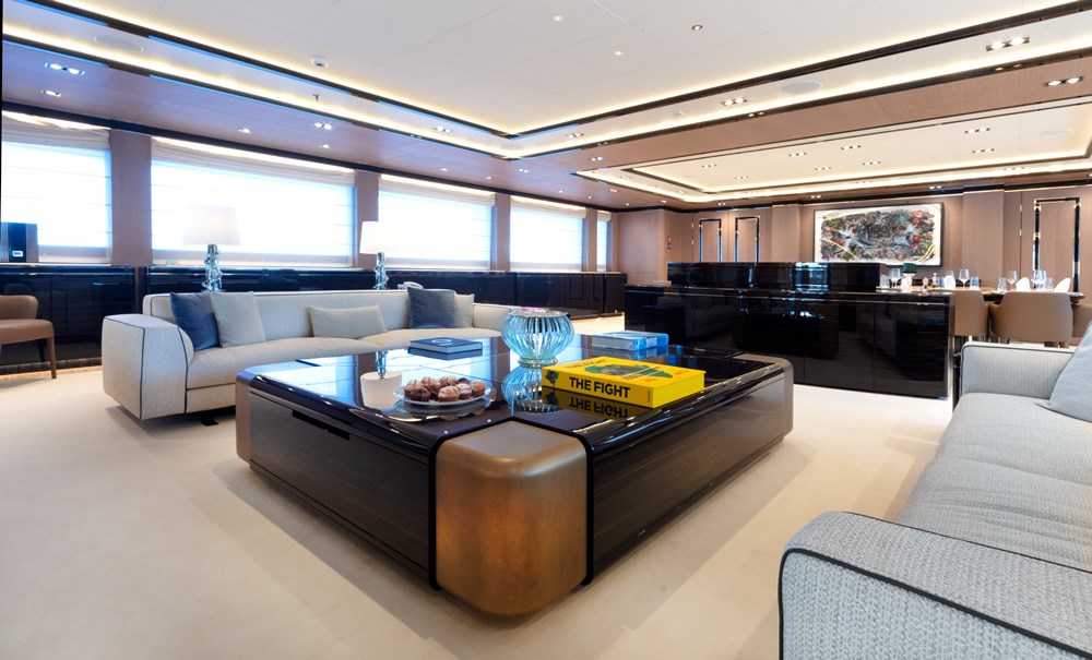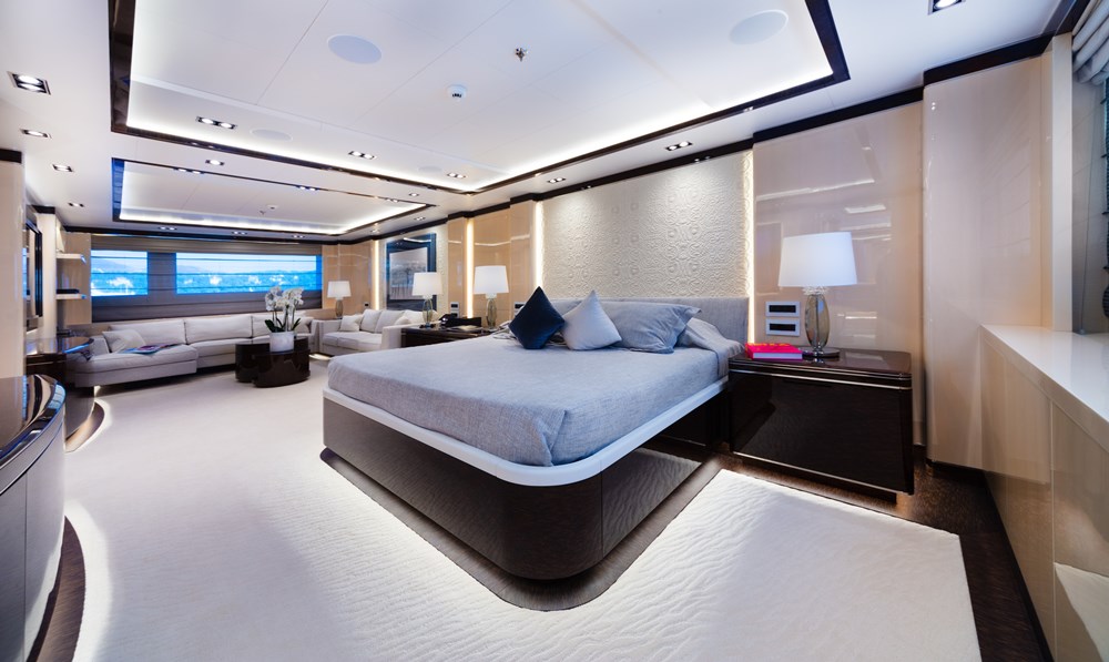 These practical touches underpin a soothing experience onboard. Studio Vafiadis, run by Giorgio Vafiadis and his son Stefano, played with natural and artificial light. This is why windows are so large and the main stairway’s steps (onyx) are backlit. So, too, they played with light and dark woods. Eucalyptus, lati (a pale yellowish brown), ebony, and more appear throughout the megayacht. Onyx, marble, mother of pearl, embroidered leathers, and lacquers appear as well. “Nothing is too shiny, too sparkly, too dazzling,” the Vafiadis team asserts. “There is balance between the very simple and the very refined.”