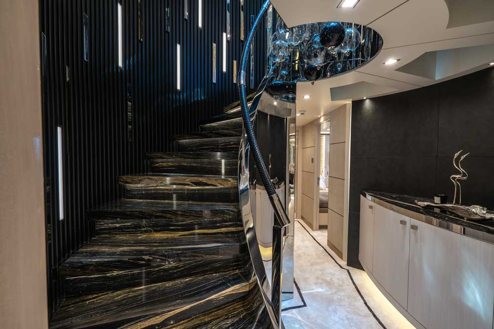 Luminous is the operative word. A glass-bottomed hot tub, for instance, spills light down through the main stairway from the sundeck (at top). It additionally illuminates a cascading glass sculpture/chandelier in the stairway’s center. A dramatic skylight benefits the master suite, too (below), which additionally has a fold-down balcony. From the saloon to the four guest staterooms and the rest of the yacht, light colors help to create an airy atmosphere.