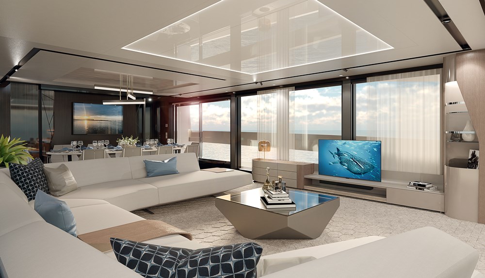 Forward on the main deck, the master suite spans the full beam, as you’d expect. It additionally has a customary walk-in wardrobe and an office. But, what you don’t expect is the arched sliding glass door leading out to a secluded dining, lounging, and sunning area.