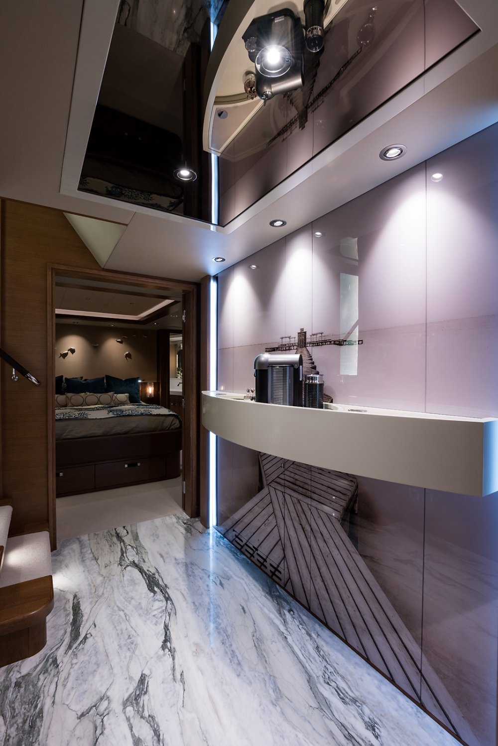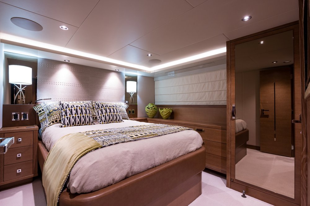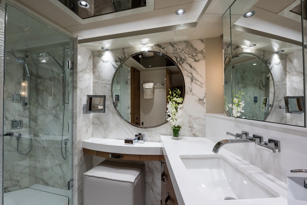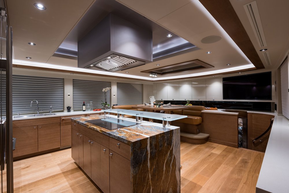 Regardless, in working with interior designer Sylvia Bolton, the owners of Hat Trick have a highly personal ambience to enjoy. More to the point, it’s casually elegant. A Nespresso machine below decks lets guests help themselves, for example. They liked her original ideas of using cerused oak (a.k.a. limed oak) and stones like amber onyx, the fittingly named Blue Jeans marble, and white marble, too. Furthermore, they appreciated the medley of unevenly stained palm bark used to cover the walls by the raised pilothouse.