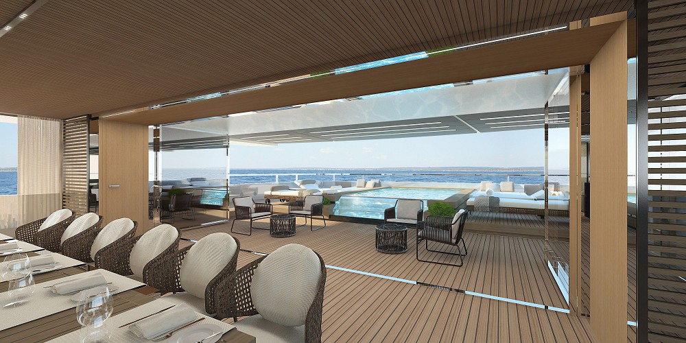 Having five decks overall and an impressive volume of 1,200 gross tons does, too. But, perhaps most noteworthy, the first Sanlorenzo 62 Steel has a transformable main deck. Just outside of the 16-person dining room, you’ll find an inviting pool. If the owners want to throw a big cocktail party, the crew can activate a sliding cover for the pool. The cover is really more like a deck, therefore adding 86 square feet (8 square meters) to the usable space.