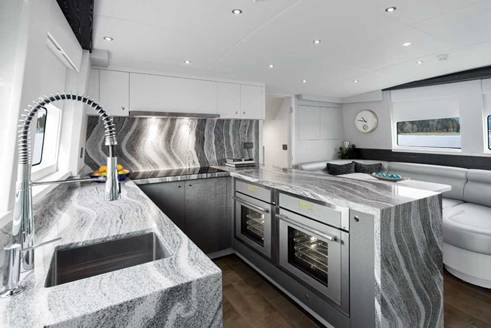 Charles worked with Marshall to develop a contemporary, elegant style for the Crescent 117’s interior. Black oak cabinetry contrasts nicely with lighter-toned stone surfaces. It does the same with the fabrics, textured walls, and overhead panels. Di-Noc wrappings, which are synthetic architectural finishes, appear as well. Interior highlights include a teak-stump coffee table with burled patterns and integrated lights. The Crescent 117 additionally shows off ultra-sparkly Gorve Collection lighting above the glass dining table. It features cubic zirconia embedded in acrylic.