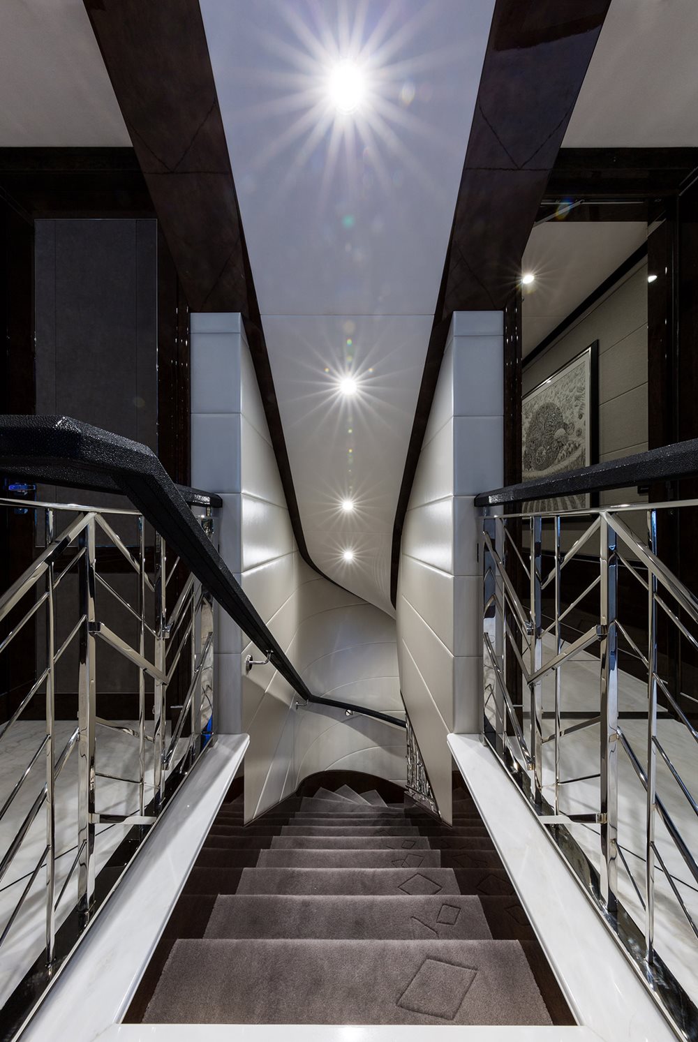 From backlit onyx in the formal dining table, to stainless steel inlays in the main foyer’s marble soles, 11.11 has stunning details. Notably, Candy himself went to marble quarries in Italy to select the marbles and onyxes used onboard. These materials, along with interactive digital artwork like a framed panel of butterflies by artist Dominic Harris, all sit amid a rich glossy walnut-paneled backdrop.