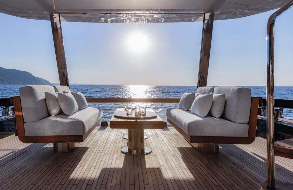 This being the first yacht that De Cotiis has designed, the artist also wanted to embrace the spirit of travel. That explains the flowing, organic shapes of the saloon settee, for example, and the equally organic shape of the stone dining table. To De Cottis, these reflect the motion of the seas. For the same reason, he chose deep blues and greens, with white. Lighting additionally plays a large role, even extending to mirrored panels on the stairway connecting the main and upper decks. The 20’8” (6.35-meter) beam feels more open and airy due to the soft shapes and open floorplan, too.