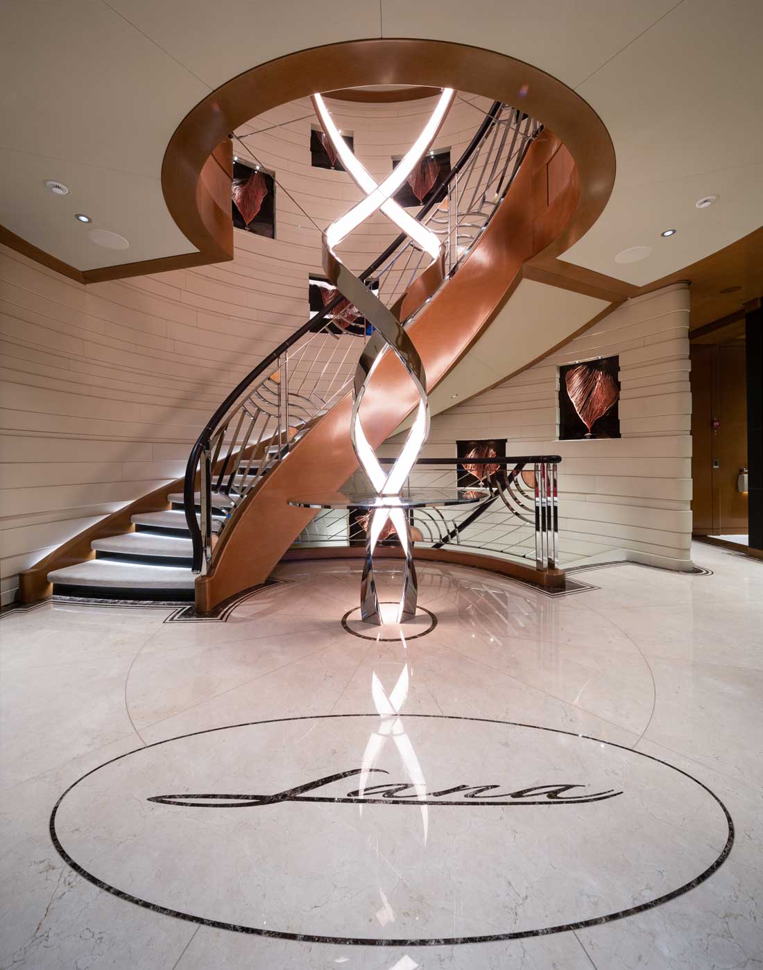 Take a virtual tour of Lana, with marble inlaid soles and Ayous-wood and leather-paneled walls, through the photo gallery above. Click on any of the images to load a larger view. With 31 crewmembers, she has a weekly charter rate starting at €1.7 million (about $2 million at press time).