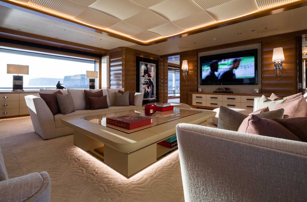 The first impression guests will have when stepping inside Lana is the impressive ceiling height. It’s 8’9” (2.7 meters). “Few vessels can offer the same airy spaces onboard,” she asserts. It flows through the two formal dining areas (above, with backlit onyx bases), the saloons, the cinema, and the seven VIP suites, along with the master suite. Speaking of the cinema, it has an 88-inch QLED television. Guests can indulge in loud, action-packed movies without disturbing anyone in the adjacent bridge-deck saloon. Yet another 88-inch 4K QLED television and powerful sound system are in the main saloon, as an alternate midnight-movie location.