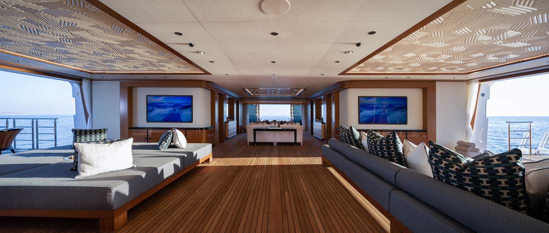 “The beach club is probably one of the best features onboard,” Stewart continues. Encompassing 1,292 square feet (120 square meters), it opens on three sides. Furthermore, it includes a gym and two seating areas. Meanwhile, just forward, the spa (above) shows off hand-made mosaics on the massage table and in the hammam. While noting that spas are a big trend aboard large superyachts, Stewart adds, “Lana’s spa is airy, flooded with light, and gives guests direct, private access to the sea.”