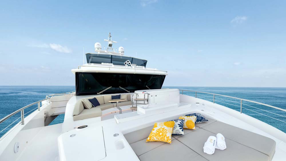 Sandy Satullo and his partner Sandra Novaes (below) have encountered a common problem in shopping for a new yacht. “Production builders may say they will work with you to personalize your boat, but in the end you only have a couple of choices and can give limited input,” Satullo says. With Horizon Yachts, however, they found “truly a custom builder.” Having taken delivery of Crowned Eagle, the couple is not simply the newest yard clients. They are the proud owners of the first Horizon FD92, and the first trideck FD series yacht at that. The model resulted entirely from their vision, too.
