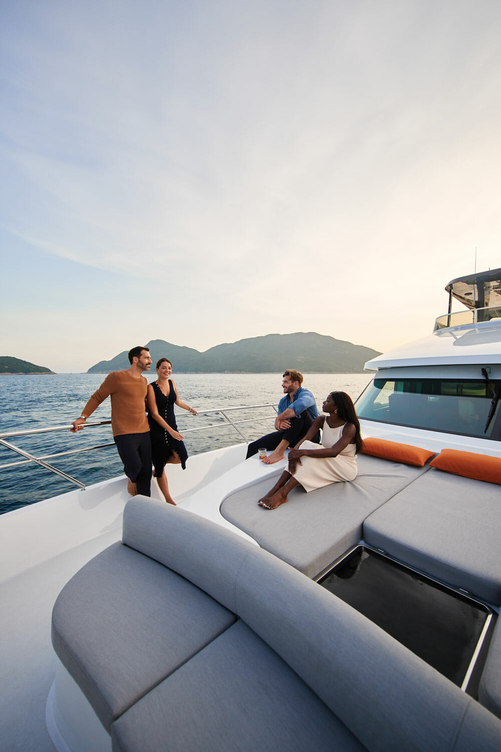 From the main aft deck to the flying bridge, the CLB88 has good spaces for lounging, sunning, and taking in the views. Furthermore, from the flying-bridge bar to the cabins, Forakis strove for a consistent theme. Ultimately, he says, “Through seamless surfaces, subtle curves, and flowing planes, I wanted to remind people at all times that they are on a ‘vessel,’ moving through space and time towards the future.”