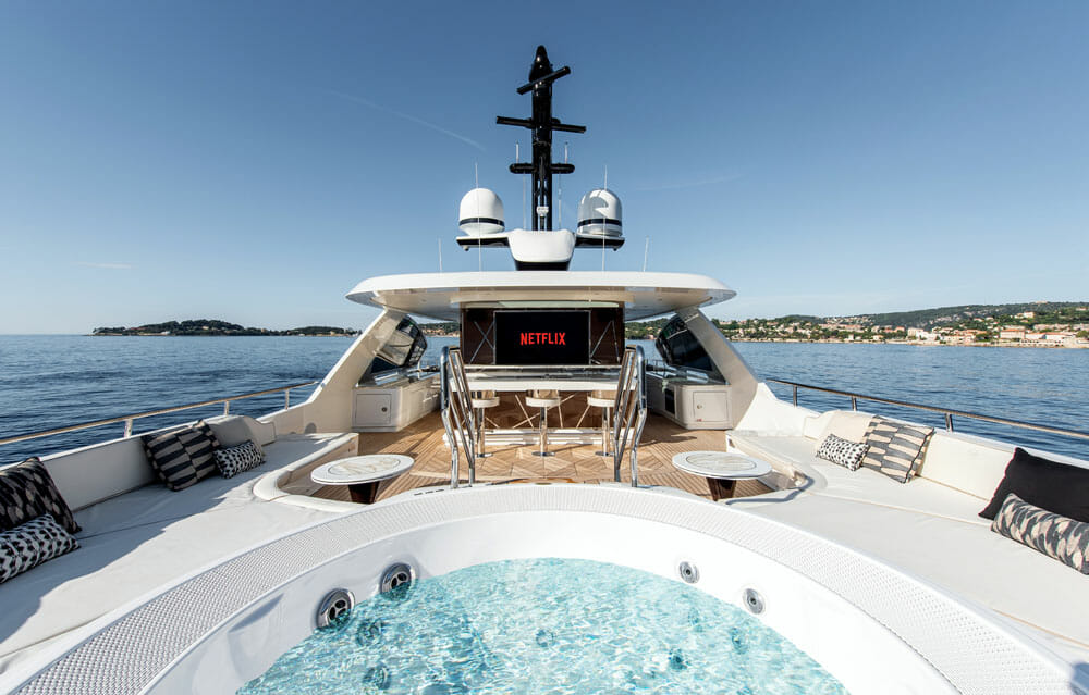 Enjoy this look at Stefania, from her 1,292-square-foot (120-square-meter) sundeck with two 75-inch TVs down to her VIPs. While she’s available for charter, she also has a sistership in build on spec. You can configure the yacht on Dynamiq’s website, including with a Bentley Home furnishings package.